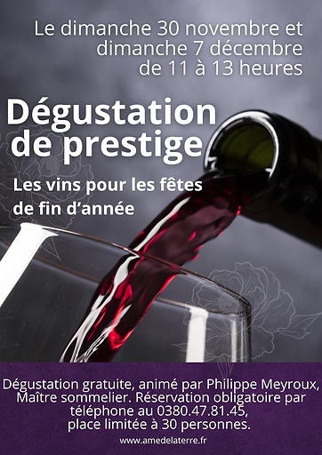 Dégustation prestige gratuite, animée par Philippe Meyroux, Maître sommelier, avec les vins pour les fêtes de fin d'année. Inscription via appel téléphonique obligatoire au 0380.47.81.45, car places limitées.