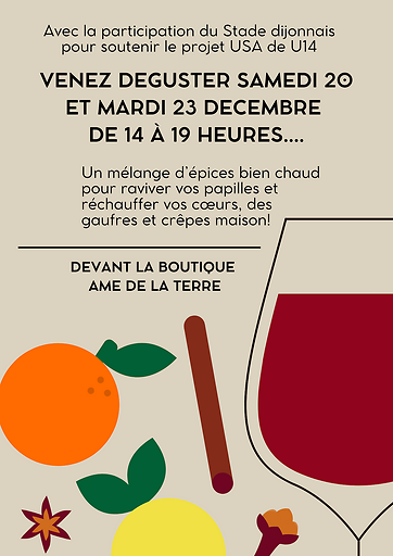 En soutien du stade dijonnais, du vin chaud ainsi crêpes et gaufres seront servis le samedi 20 et mardi 23 décembre devant la boutique de l'Ame de la terre. Venez soutenir les U14 pour un voyage en Philadelphie.